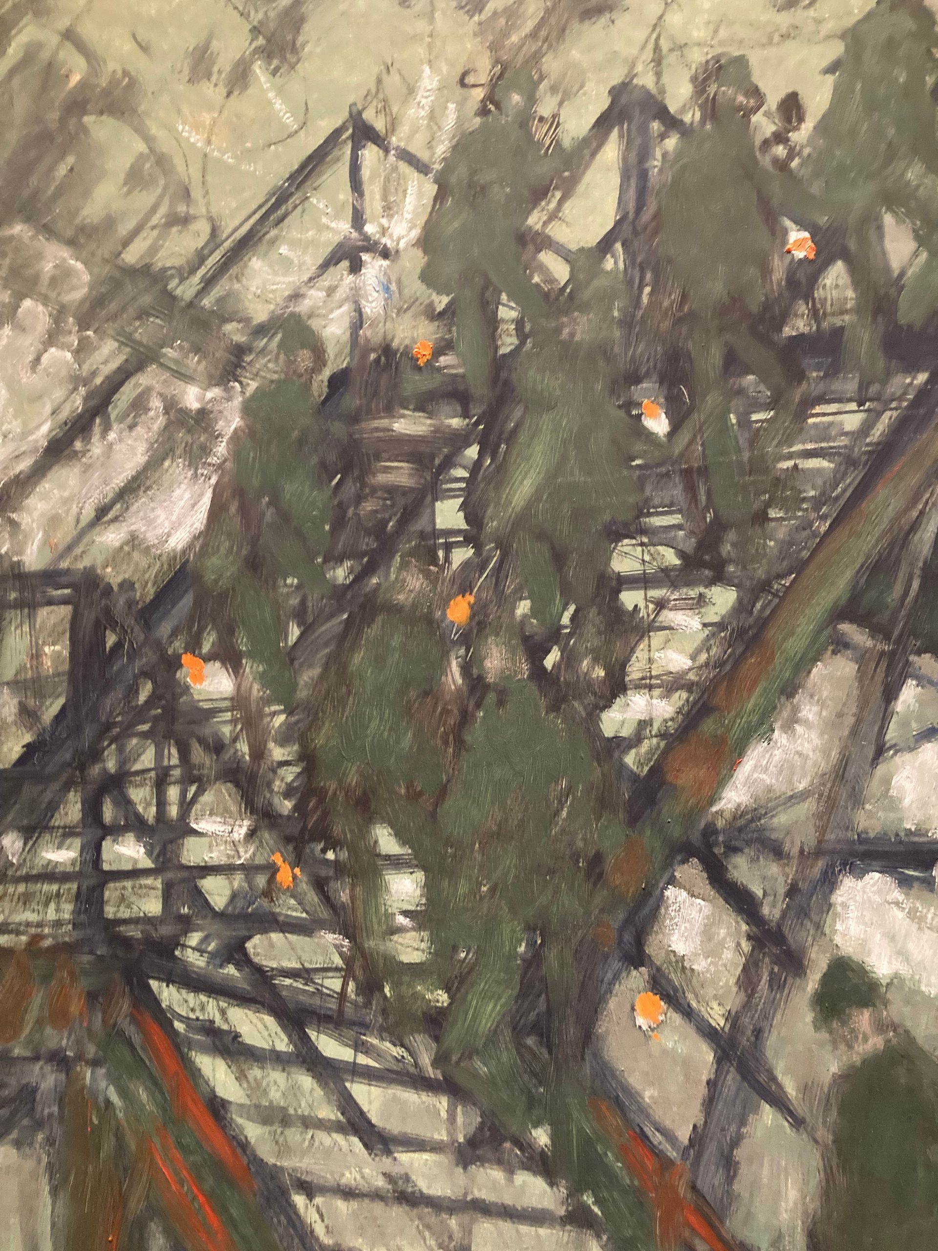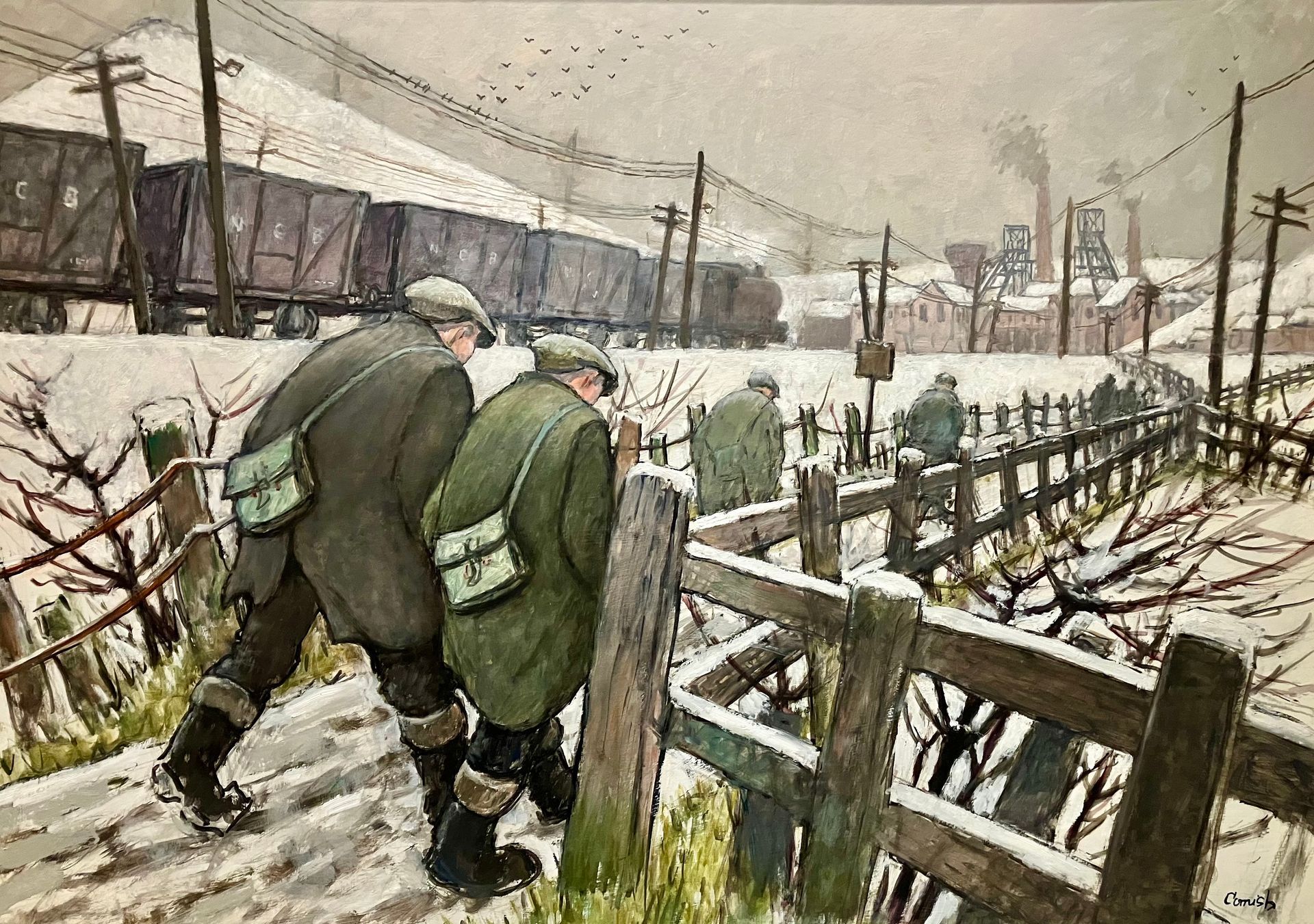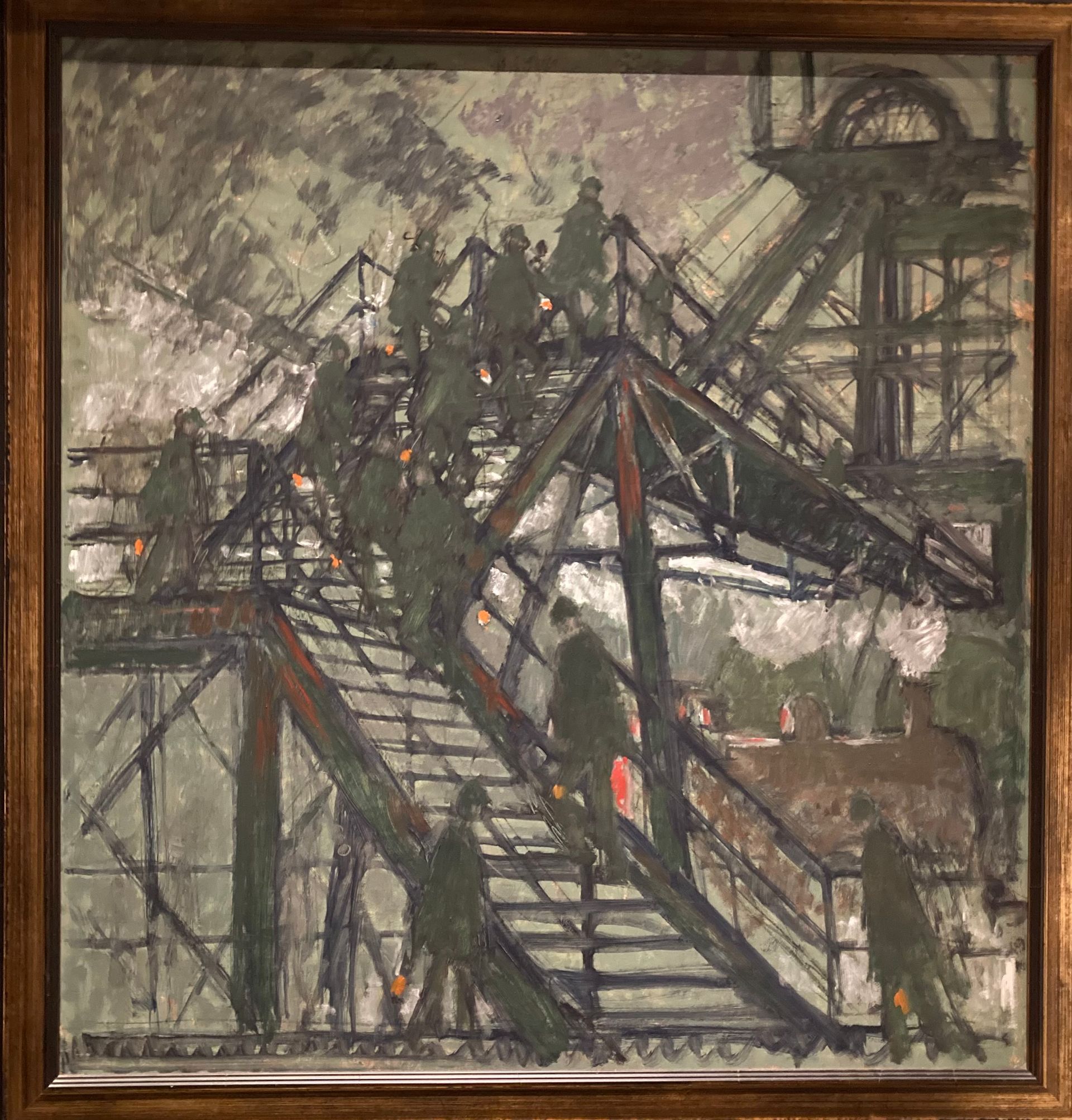 I really enjoy the style, uniqueness and expertise of both painters. With Norman Cornish I like how he has the people in his paintings leaning in towards each other, in conversation, along with the clever way light is brought in, such as the thick orange paint for the light of the miner's lamps as they climb up the gantry. If you take a closer look you can see the thickness of the paint here, this light brings balance to the dark painting.