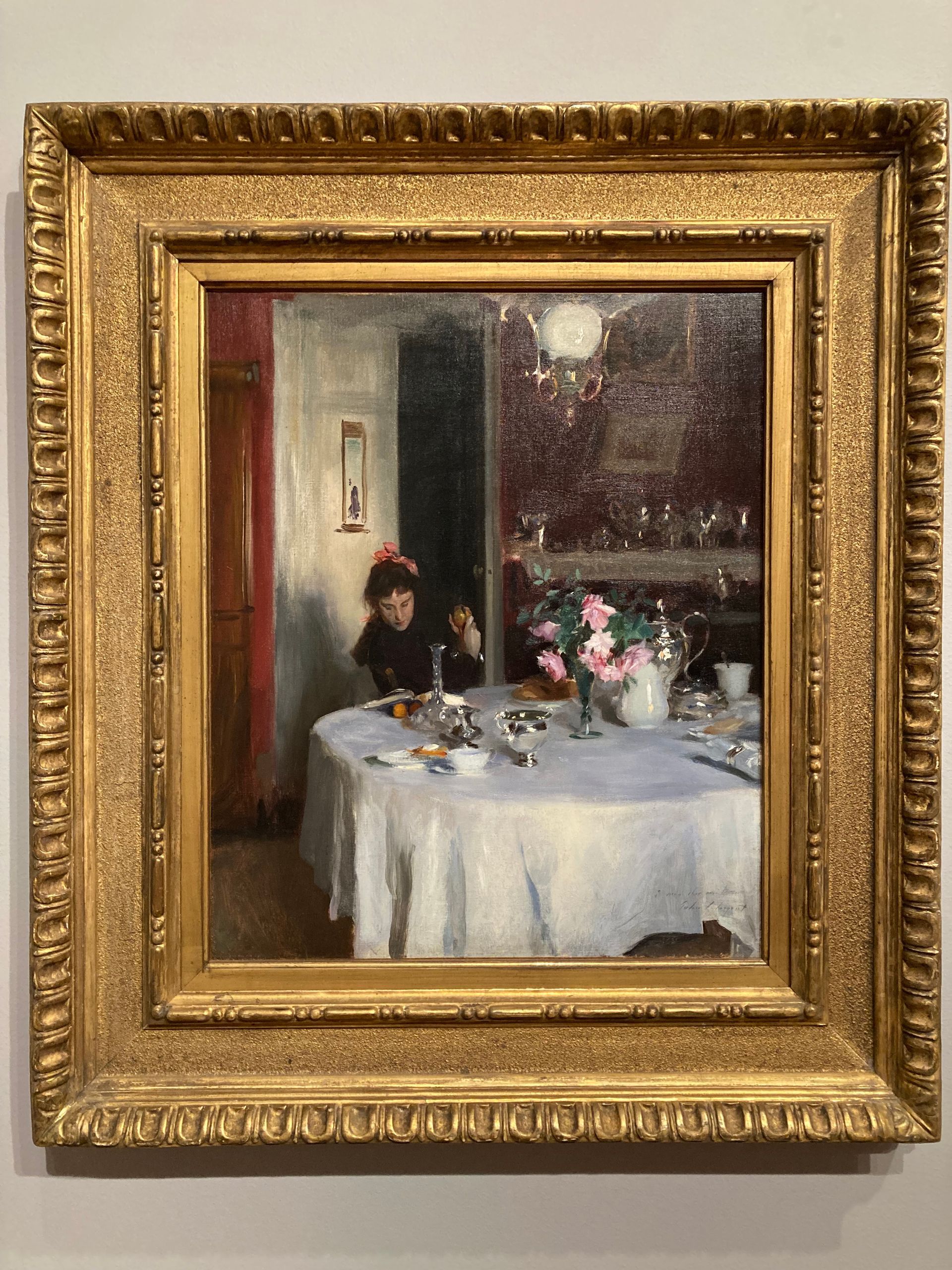 6) The Breakfast Table by John Singer Sargent - Sargent's sister violet is peeling an orange, while reading a book at the breakfast table, with its silver coffee service set. The polished silver stands out on this painting, along with the pink roses, and the light from outside brightening the room. This demonstrates Sargent's painting skills.