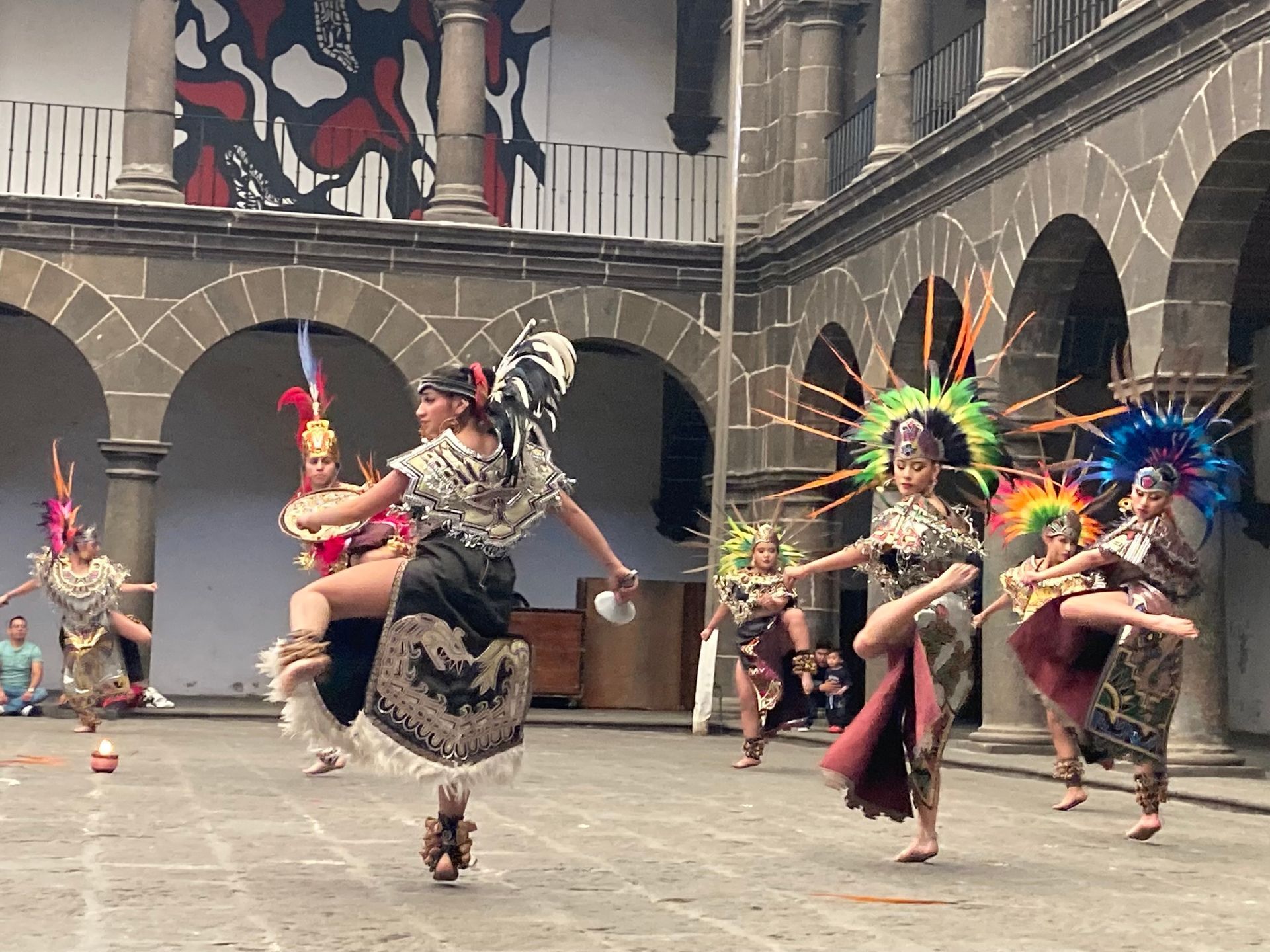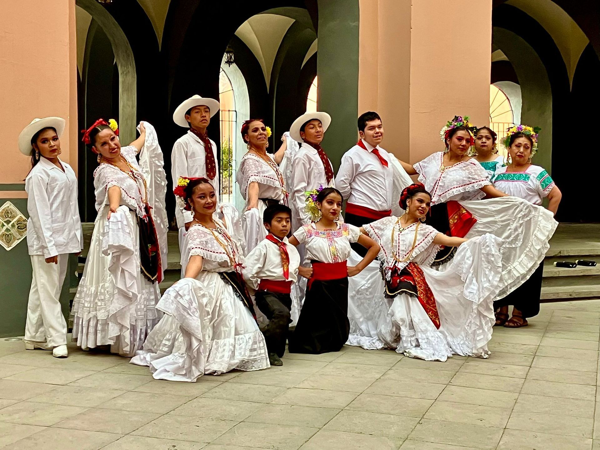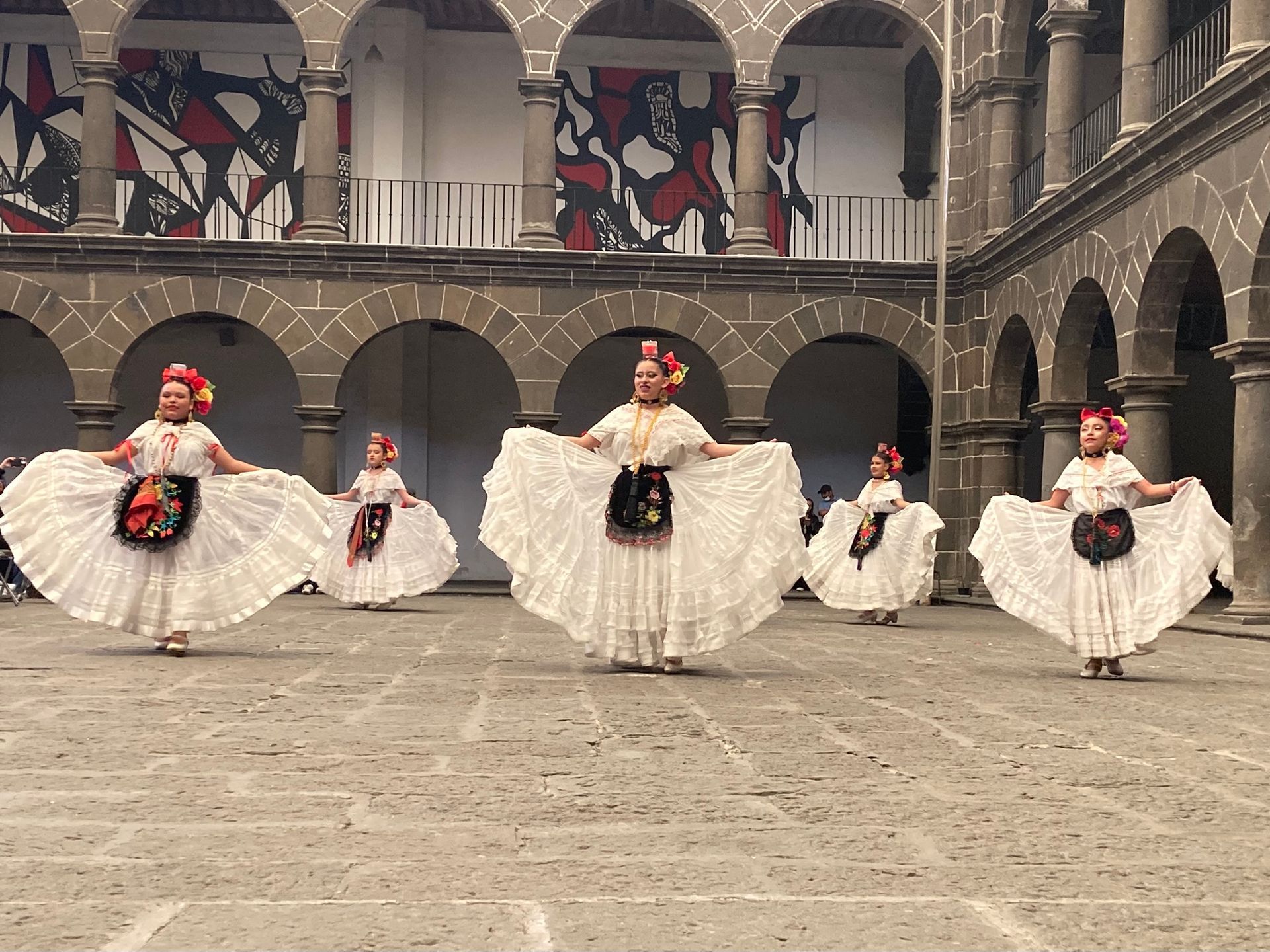 At the San Pedro Museo de Arte, in the vast courtyard, a traditional dance performance unfolded: skirts swirling, heels striking rhythm against the stone. Different groups took their turn. Older women moved with practised grace, their long, floating dresses sweeping the ground as they smiled at one another. Then came younger dancers — girls in brightly coloured, full-skirted dresses that flared with every spin, and three boys in crisp white suits and cowboy-style hats, their choreography full of jumps, stamps, kicks and sharp heel strikes. Finally, a group performing in Indigenous-style dress entered, joined by a male dancer who circled them holding a flaming bowl, weaving fire into the rhythm.