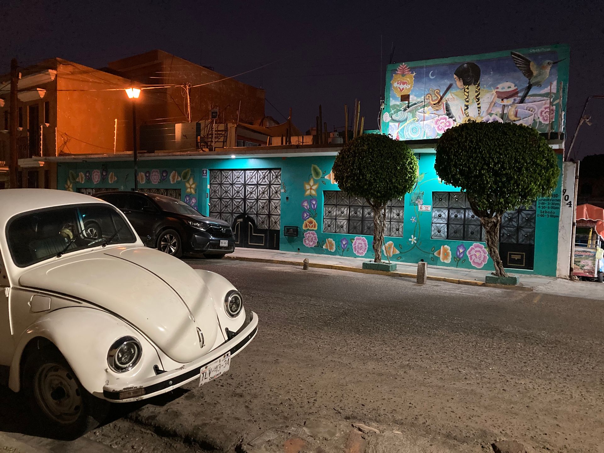 After an afternoon of sun and reading by the pool — necessary, both — we went up to Xochimilco, the barrio north of the centre. The name is older than the Spanish city: Nahuatl, meaning 'flower gardens', the same name as the famous floating gardens district of Mexico City. In Oaxaca, it is a neighbourhood of cobbled streets, painted walls and an outdoor gallery culture that seems to have grown organically from the community rather than being applied to it.