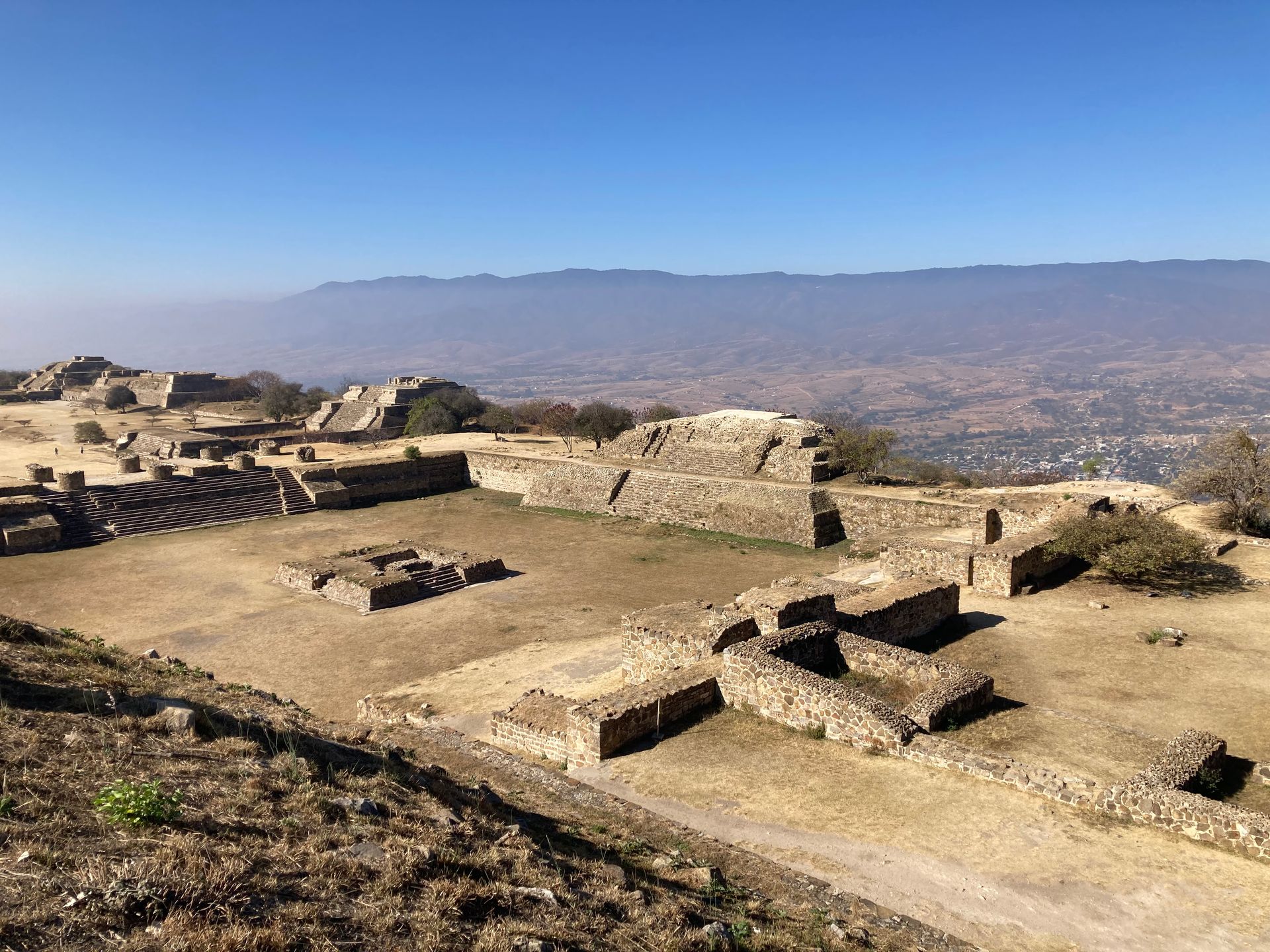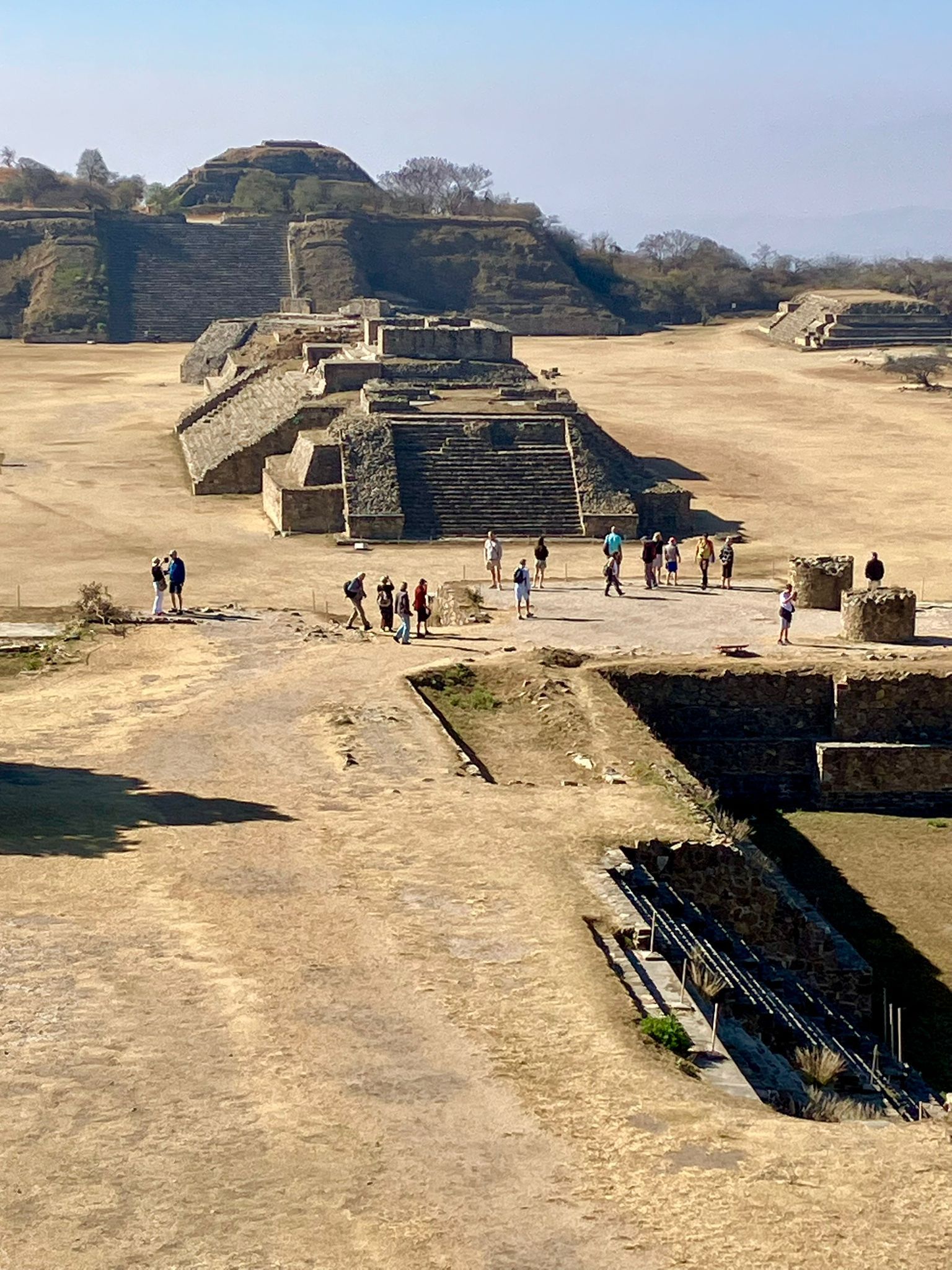 We climbed the pyramids slowly, pausing to breathe and to look. From the top, the three valleys open in all directions toward modern Oaxaca, which appears small and recent from this height. The Zapotecs chose this position for exactly the reasons you would choose it: commanding, symbolic, theatrical in its relationship to the landscape.
