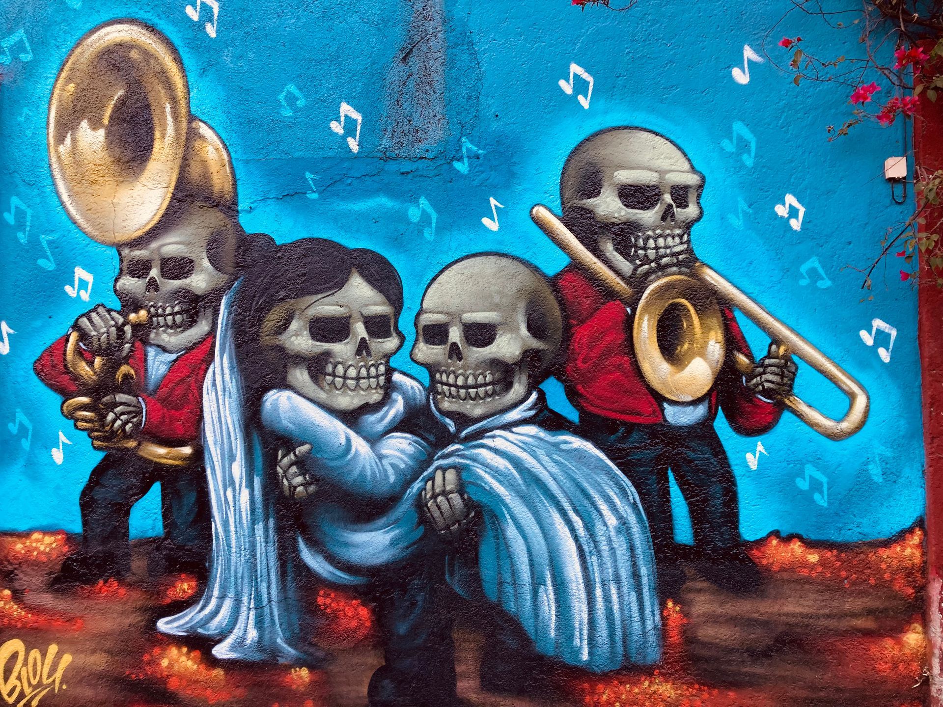 In the afternoon, we walked to Jalatlaco: another neighbourhood of murals. Cobblestones, adobe walls painted in burnt orange and terracotta and ochre, and on every corner something worth stopping to photograph. Catrinas, Tehuana women, scenes from Oaxacan cultural life — all executed with the confidence of artists who know their subject. Jalatlaco is not curated. It has simply grown this way.