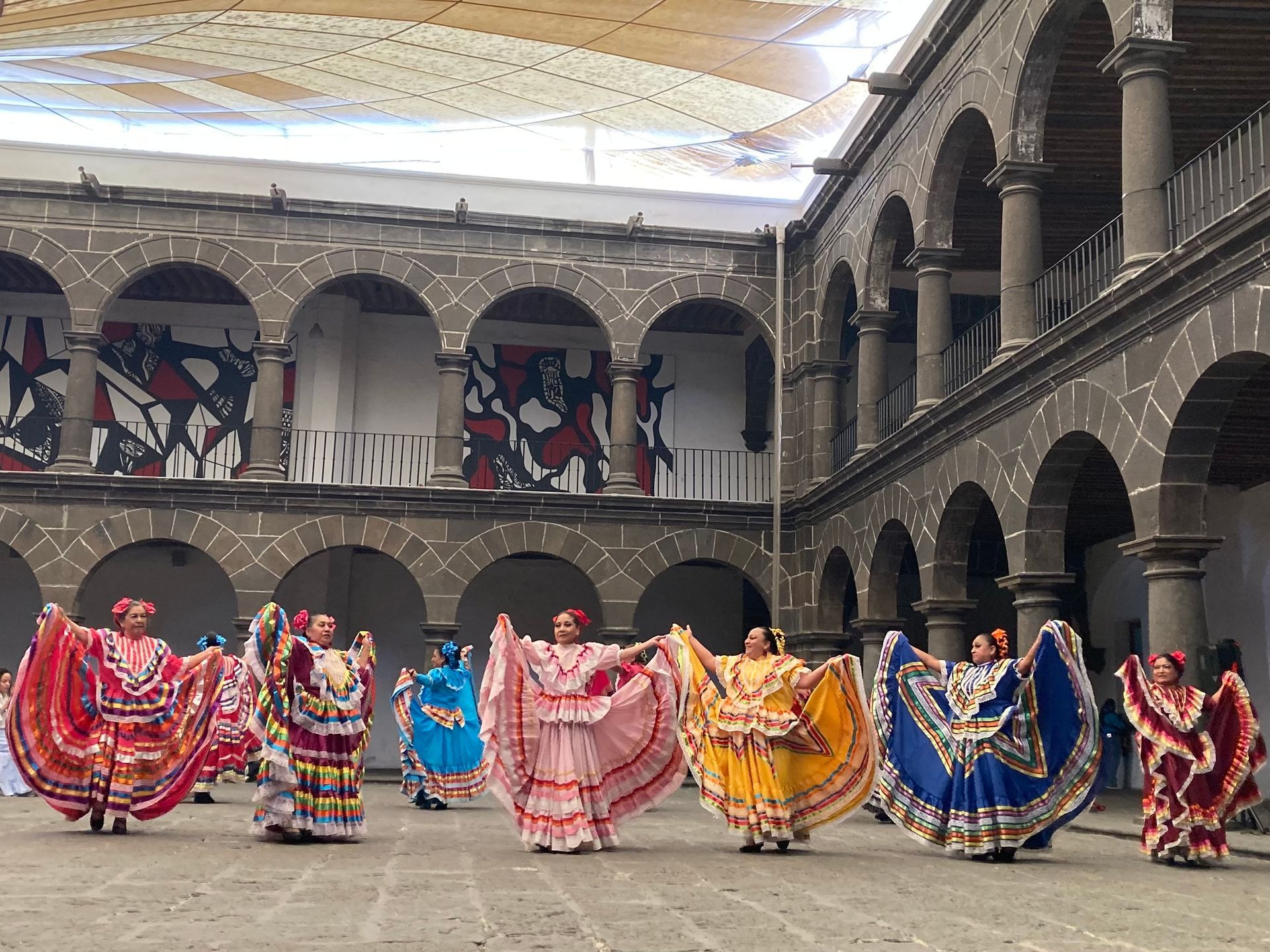 In the afternoon, the Convento de Santa Rosa de Lima — its kitchen entirely covered in blue-and-white Talavera tiles, glowing softly in filtered light. Our guide explained the community's life, its prayer and service. Ceramic Trees of Life the Holy Trinity, elaborate China Poblana dress, regional textiles. Then, in one of the courtyards, a dance performance began featuring two groups of dancers — one mostly young girls, the other mostly women — all dressed in traditional clothing. In one scene, a young girl and boy playfully ‘fought’ over a pottery vase; when the boy’s antics led to it breaking, he carefully replaced it, and the pair departed laughing and reconciled. Another performance featured long, colourful ribbons, which the dancers wove and twisted with their movements to create a living, three-dimensional ‘cat’s cradle’ that shimmered across the courtyard.