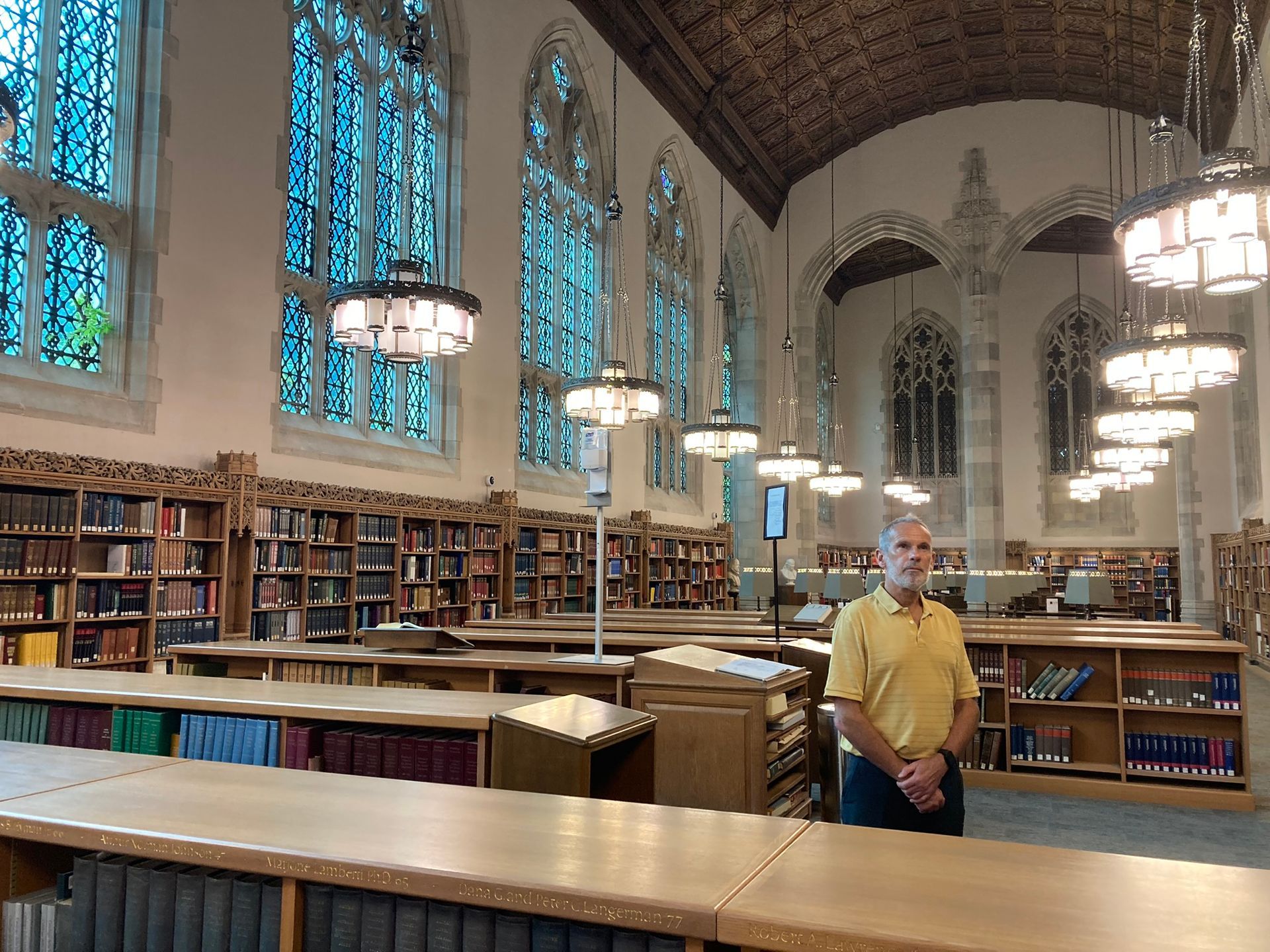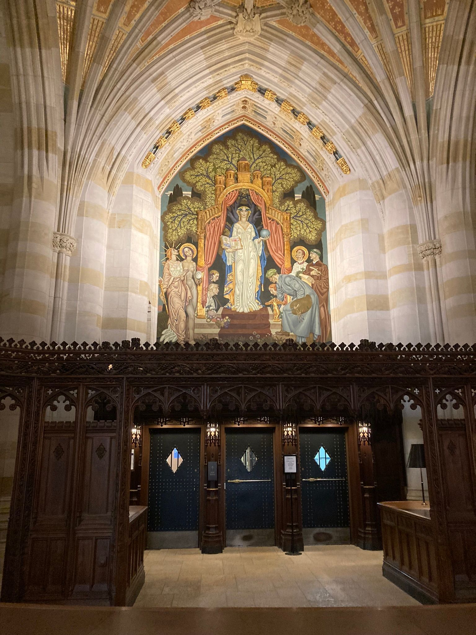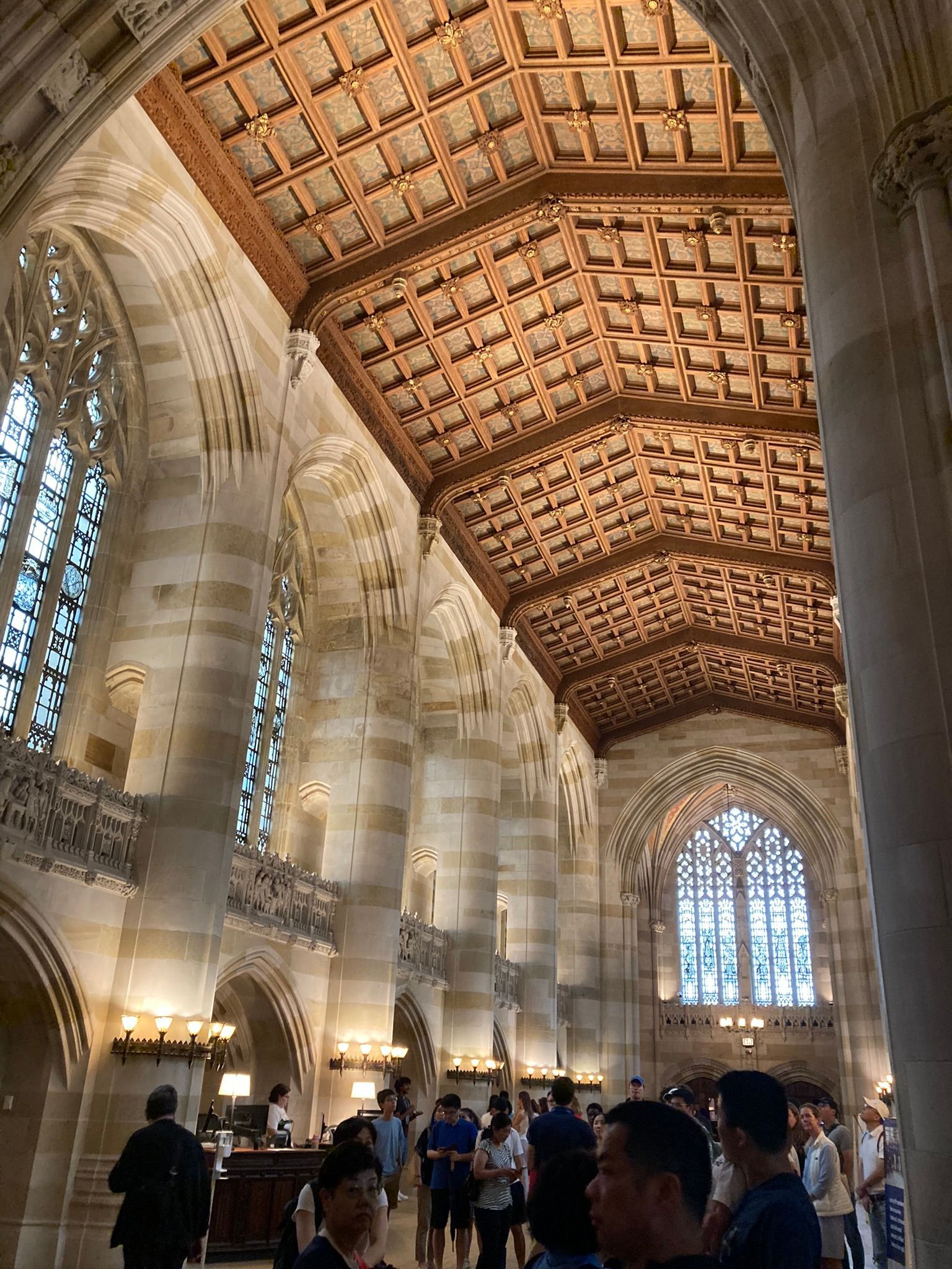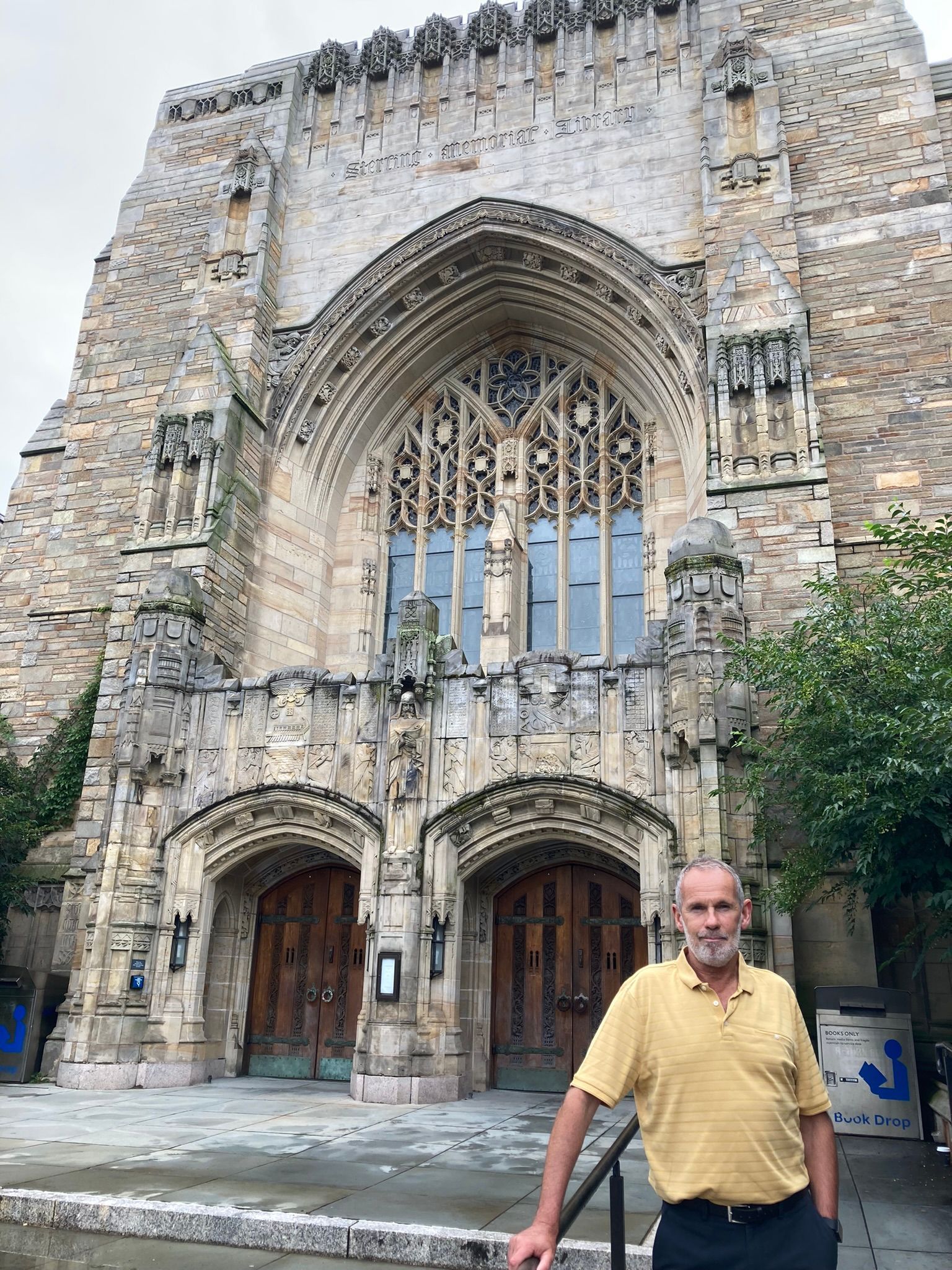 The tour took us to different buildings on the campus and the young student was able to tell us stories about the statues, and about the academic requirements of the university. She told us that the Sterling Library had originally been designed to be a cathedral but there was no requirement for a cathedral on the site so they used the design and built a library instead. It is a beautiful building reminiscent of the cathedrals in Europe but filled with books, beautifully painted ceilings, and free to wander around