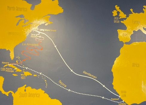 The New Haven Museum is located in an old building, fairly close to the Peabody Museum. There is currently a fascinating exhibition about the Amistad rebellion in 1839. It begins by explaining how Sengbe Pieh, a Mende rice farmer, led the group of African slaves to take control of the vessel. After some violent fighting, Pieh ordered the Spanish slaveholders on board, José Ruiz and Pedro Montes, to sail back to Sierra Leone, from where the captives had been taken. If you look at the map you’ll notice the zig-zagging this was because in the day, they headed east towards Africa, but at night, Ruiz and Montes covertly turned the ship the other direction. After several weeks of this back-and-forth, La Amistad was intercepted by a U.S. Navy vessel off Montauk. The captives were then brought to New Haven, where they were tried for their crimes of pirating the ship and imprisoned.